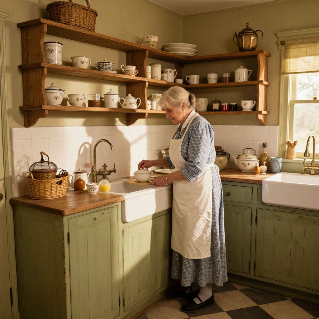Photograph of elderly woman with white hair, wearing blue checkered apron and green dress, washing dishes in vintage-style kitchen with wooden shelves, green