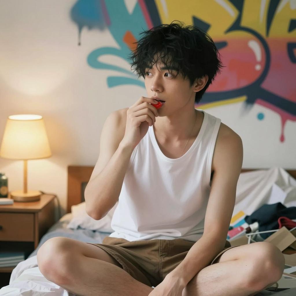 Young Asian man with short, messy black hair sitting cross-legged on a cluttered bed. He is wearing a white sleeveless tank top and brown shorts, holding a small red object near his mouth while looking thoughtfully to the side. The room features a bedside table with a lamp emitting warm light and a brightly colored abstract graffiti wall behind him.