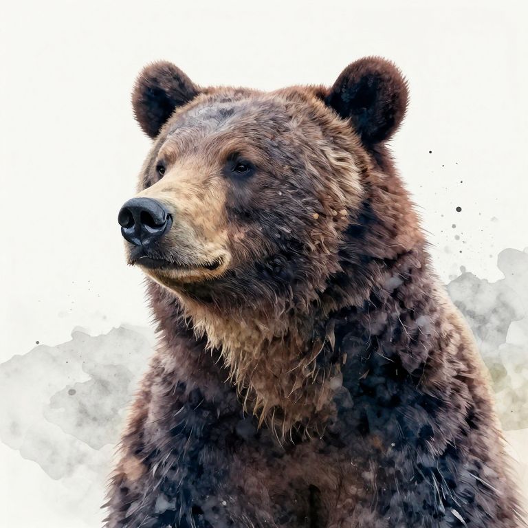 Double exposure, shadowy silhouette bear, animal head, merged with a mountain, In the style of a watercolor painting, ashy splatter backdrop, vibrant, amazing details, amazing artist, sharp edges, full view, atmospheric lighting, amazing visuals