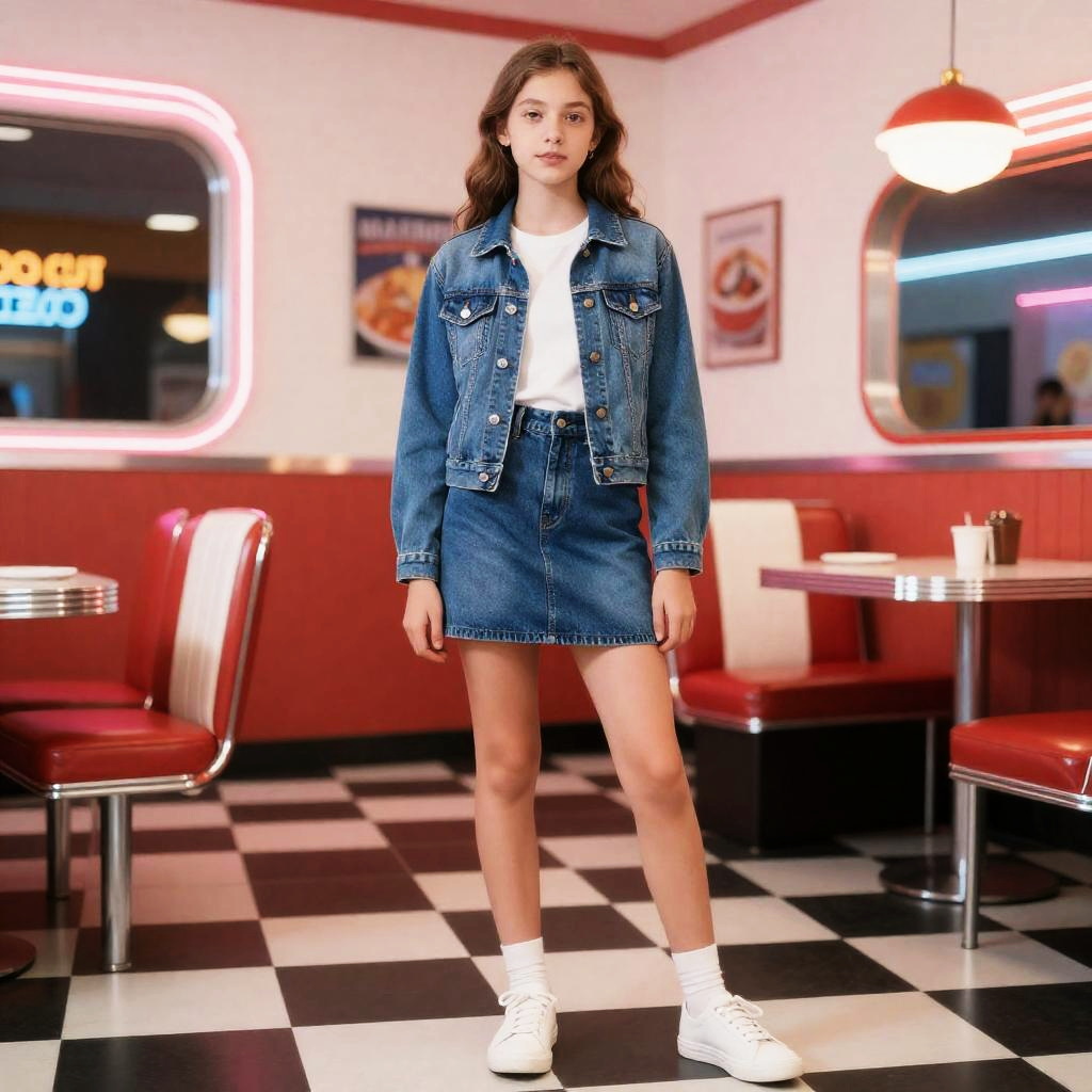 Realistic photo.Full body portrait of a teenage girl wearing a trendy denim jacket and skirt, posed against a retro diner setting, with neon lighting realistic photo