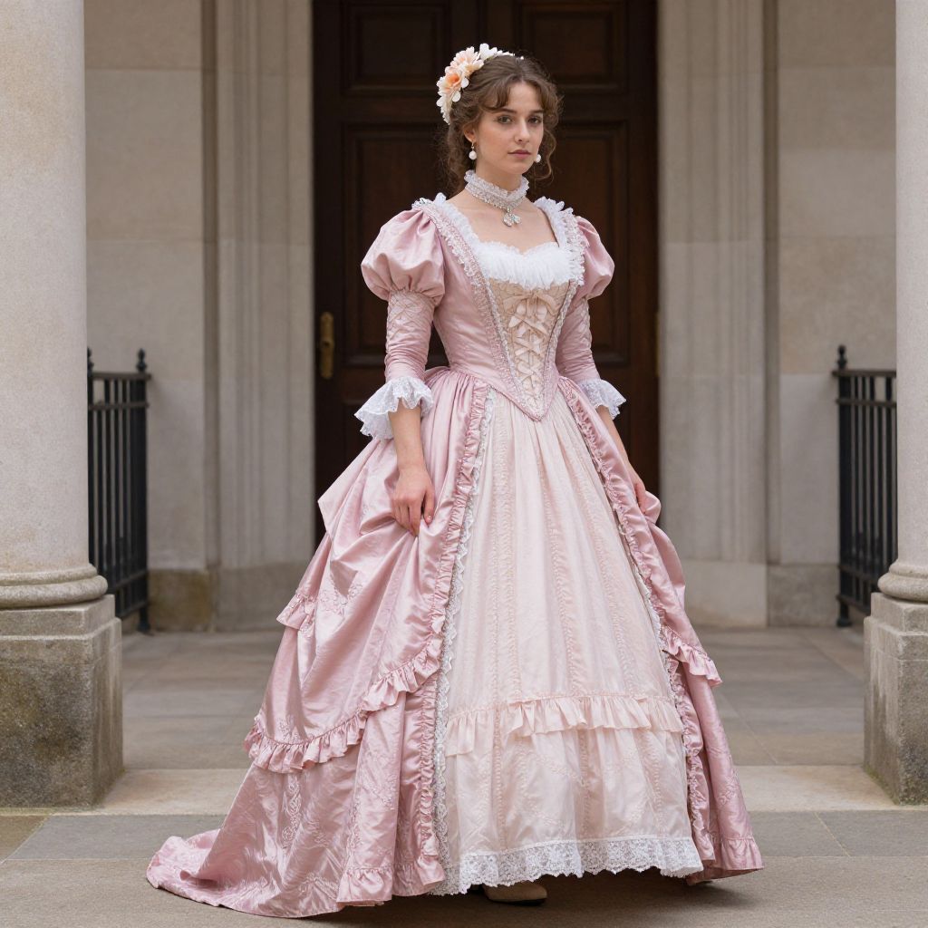 Photograph of a young woman standing in front of a grand, classical building with tall columns and a dark wooden door. She has fair skin, brown curly hair, and wears a pink, Victorian-style gown with puffed sleeves, lace trim, and multiple layers of ruffles. The dress features a fitted bodice with intricate embroidery and a white lace collar. She accessorizes with a white floral hairpiece and a pearl necklace. The background includes a stone pavement and black iron railings. Her expression is composed, and she looks directly at the camera. The overall style is elegant and historical.