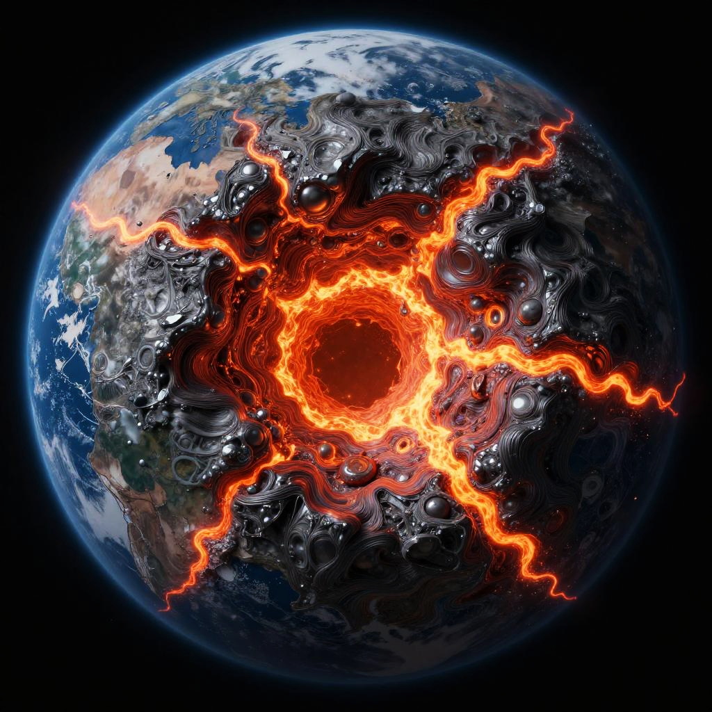 Core of the Earth real picture, artistic but realistic depiction of Earth's core with glowing liquid metals, intricate textures of iron and nickel, magma flows in deeper layers, captured with dynamic lighting and authentic geological colors