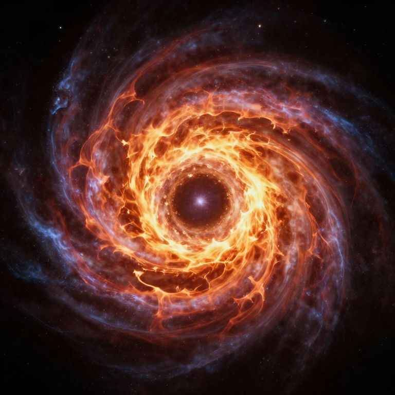 Digital art of a vibrant, swirling vortex of fiery orange and red flames with blue and white nebulous edges against a dark, star-speckled space