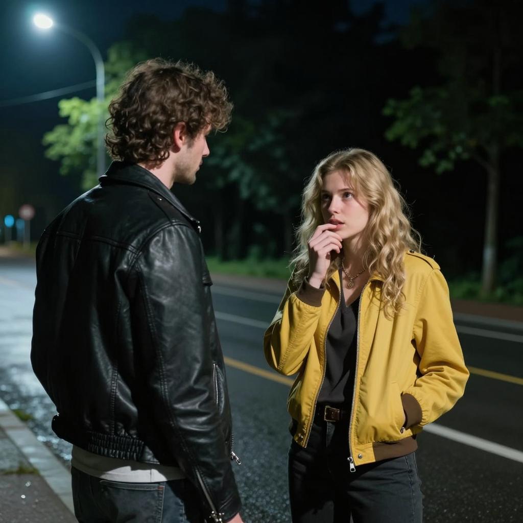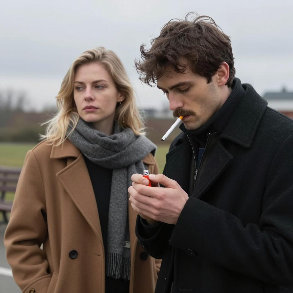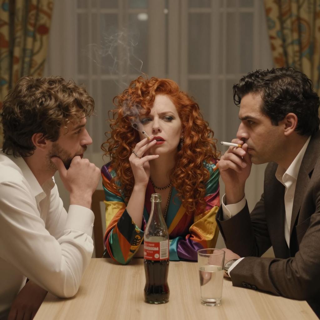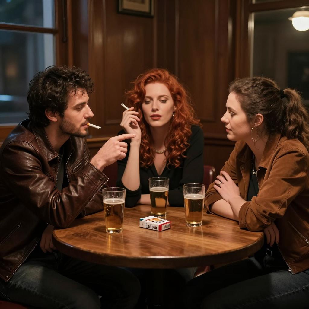 Three people sit at a round wooden table in a dimly lit room. The man on the left with dark hair and a leather jacket points with his right hand, smoking a cigarette. The woman in the center with red hair and a black top holds a cigarette in her right hand. The woman on the right with brown hair in a ponytail wears a brown jacket and rests her elbows on the table. Four glasses of beer and a pack of Marlboro cigarettes are on the table. Wood-paneled wall and window in the background.