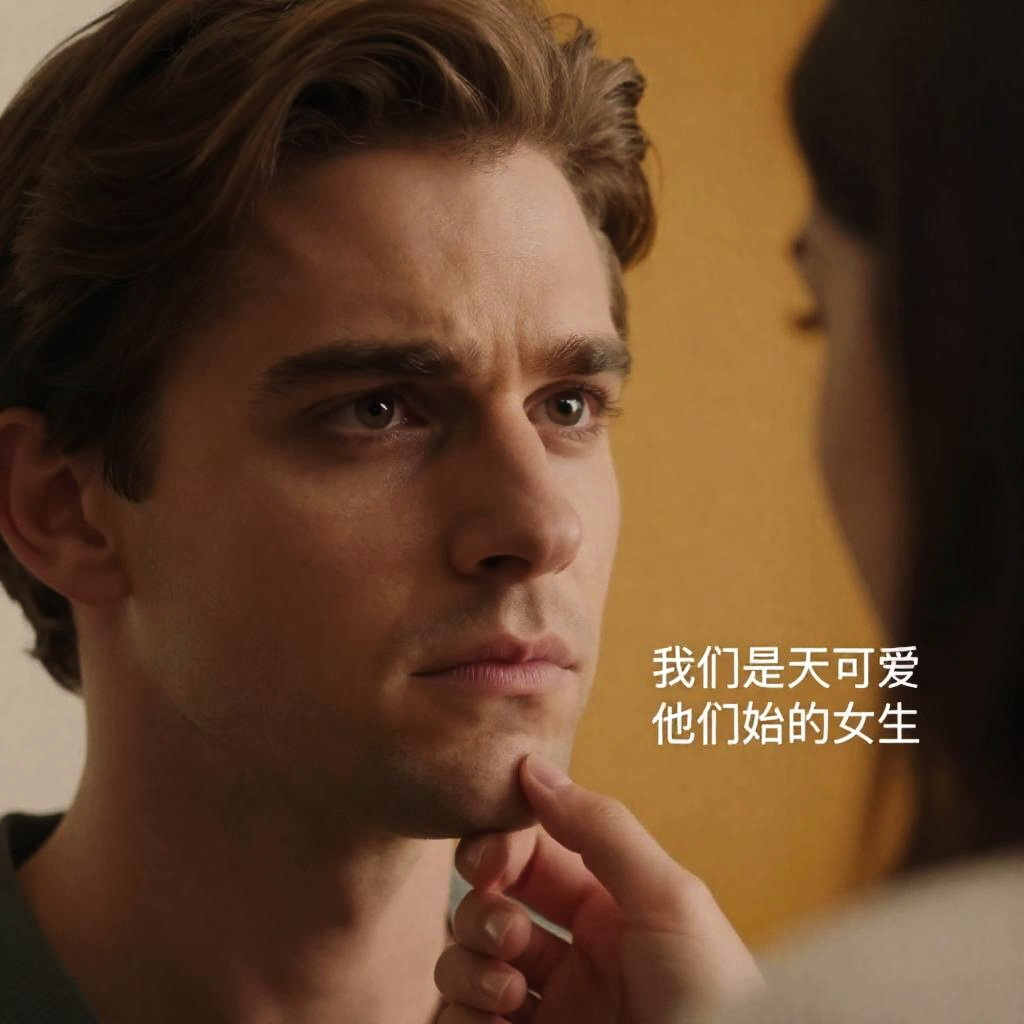 Photograph of a close-up, intense-looking male face with light brown hair, slightly furrowed brows, and a contemplative expression. Background is a warm, orange-yellow light. Right side shows a blurred, partially visible female face with long dark hair, wearing a white top, touching the man's chin. Text overlay on the right.