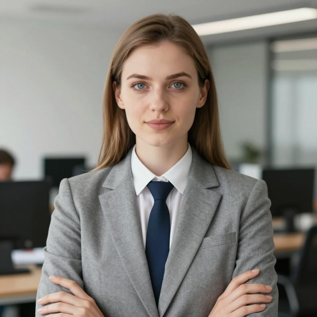 Close-up portrait of a confident young woman with fair skin, blue eyes, and light brown straight hair parted on the left. She is wearing a grey blazer, white shirt, and navy tie with arms crossed, standing in a professional office environment with modern furnishings and soft lighting. The expression is poised and professional, embodying corporate elegance and business professionalism.