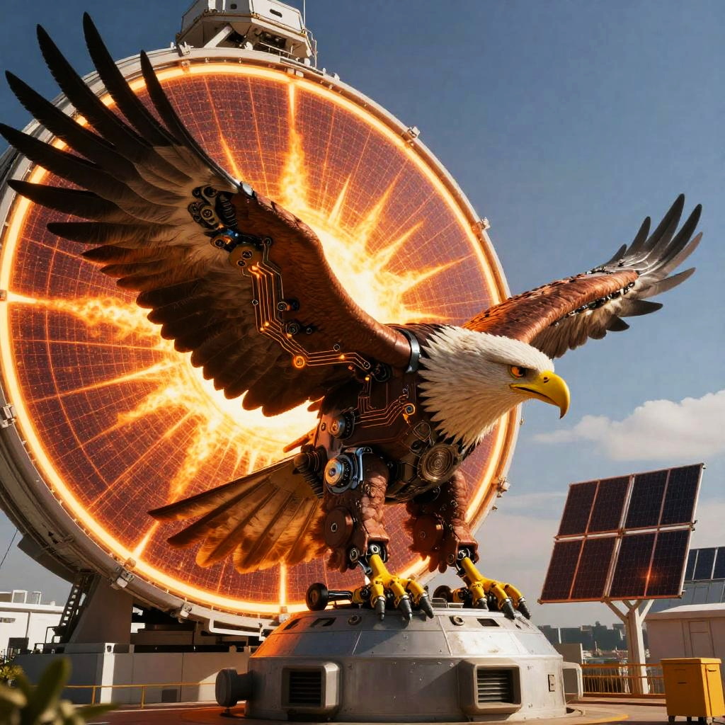 Highly detailed solar flare observatory scene, hyper-realistic 4K rendering, volumetric lighting, massive solar panels and sunscreens backdrop, mechanical eagle with thermo-regulated joints and sunburst circuitry, warm intense futuristic atmosphere, detailed fur with lifelike textures, cyberpunk aesthetic.