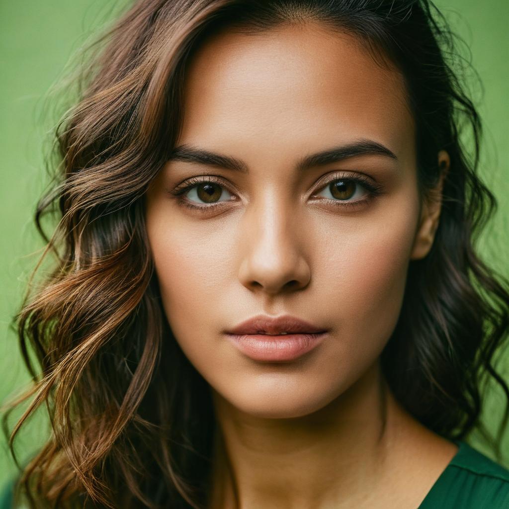 A close-up portrait of a woman against a green background, featuring cinematic lighting that highlights natural skin tones with warm brown and olive green hues, film grain texture adding depth, elegant mood expression, detailed facial features, wet hair styling, professional photography style