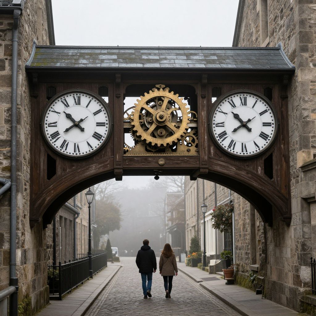 Photograph of a stone alleyway with a large, wooden clock archway at the center. The arch features three clocks (two traditional, one with visible gears) with white faces and black Roman numerals. The clocks are set in a dark wooden frame. Below the clocks, a central gear is visible. Two pedestrians, a man and a woman in winter clothing, walk away from the camera down the cobblestone street, which is flanked by stone buildings. Overcast sky and mist add a moody atmosphere. The alley is lined with black railings and small potted plants.