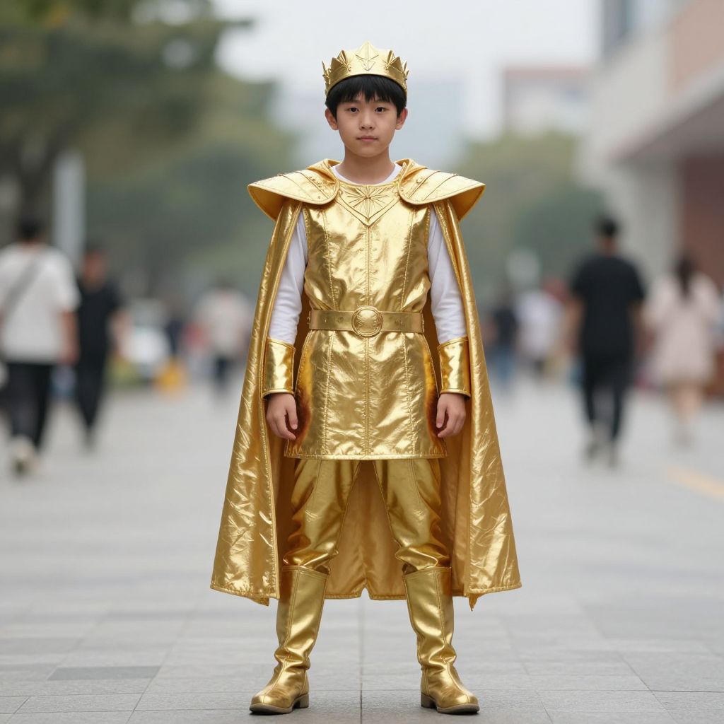 Gold god costume, male focus, 1boy, cape, boots, standing, full body, hat, solo focus, outdoors, blurry background, blurry