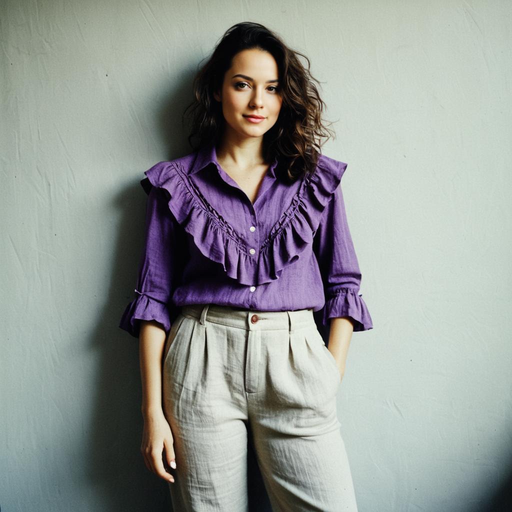 Ruffle Shirt Woman, woman in a purple shirt and linen trousers posing for a picture