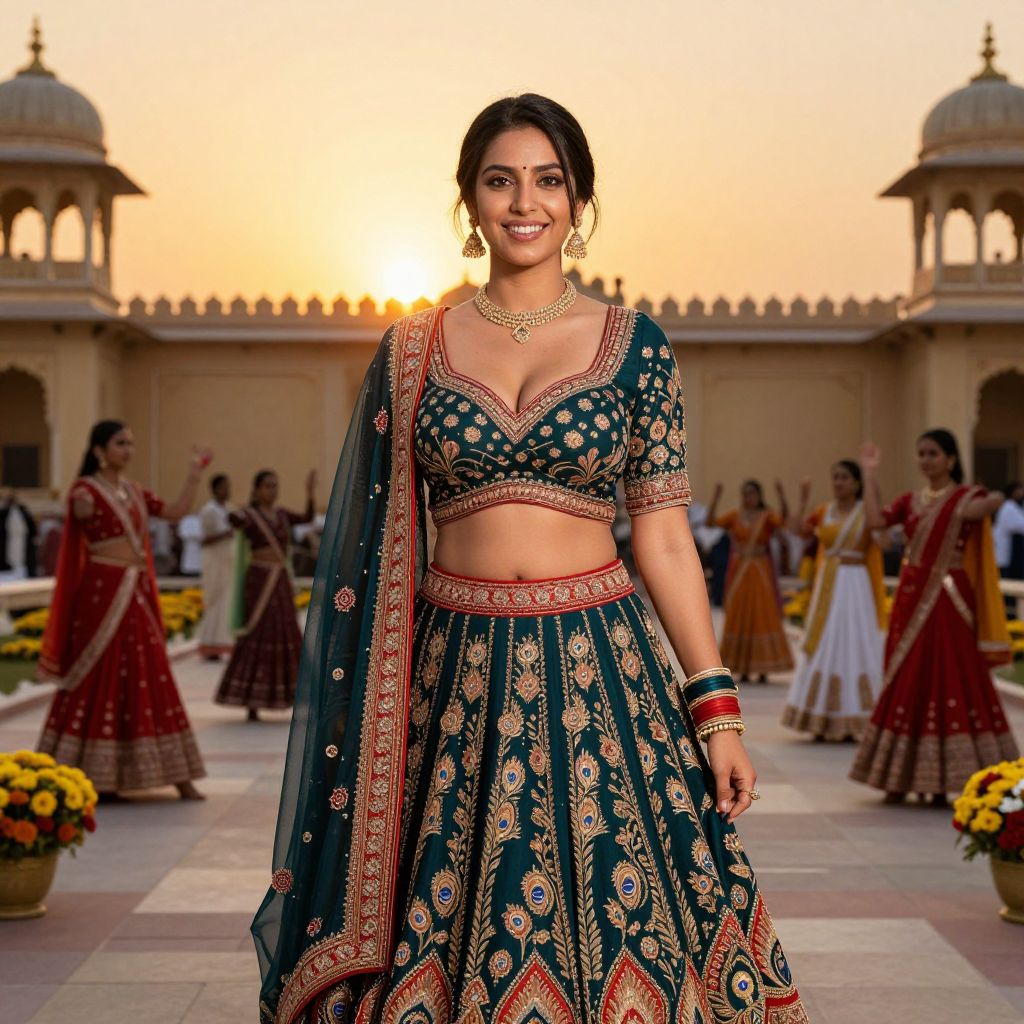 A radiant woman with olive skin, bright smiling eyes, and straight dark hair tied in a simple updo, wearing a richly designed lehenga choli with peacock motifs and crimson border, standing in a royal palace courtyard during a cultural festival with dancers, flowers, and a golden sun setting behind her.. The woman has big tits and cute face