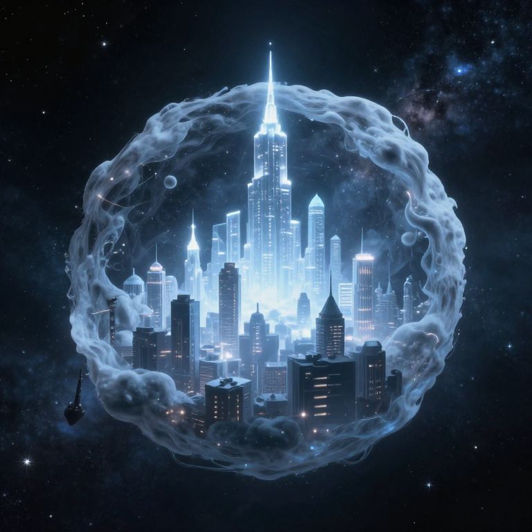 Digital art of a glowing blue skyscraper city enclosed in a swirling, ethereal cloud against a starry night sky.