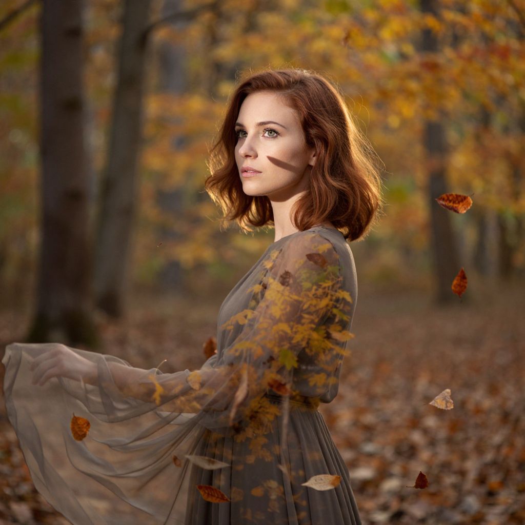 A woman with chestnut hair and captivating green eyes stares into the distance, her serene expression hinting at profound contemplation. She stands amidst a vibrant autumn forest, leaves swirling around her as if they were an extension of her flowing dress. Soft backlighting through the trees casts elongated shadows on her face, accentuating the graceful lines that time has bestowed upon her. This interplay between nature and human form creates an ethereal double exposure effect, where she seems to embody both a part of nature and an observer—a symbol of resilience amidst the ever-turning seasons, inviting viewers to reflect on life's enduring cycles.