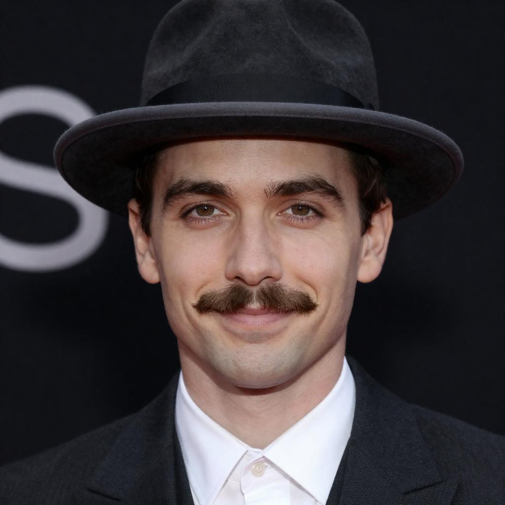Photograph of a white man with a thin mustache, wearing a dark hat and suit with a white shirt. He has a slight smile, light skin, and short brown hair. Background is dark with indistinct shapes. Man is centered, facing camera.