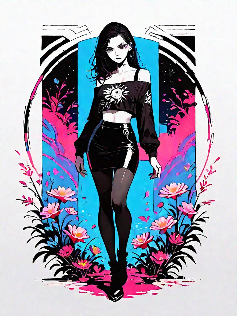1girl, source_comics, realistic face, full body shot, Woman, modern casual, blush pink blouse with wide, long bishop sleeves, crew neck, black A-line mini skirt with front zipper, sheer black tights, black ankle boots with medium heel, minimalist studio background.