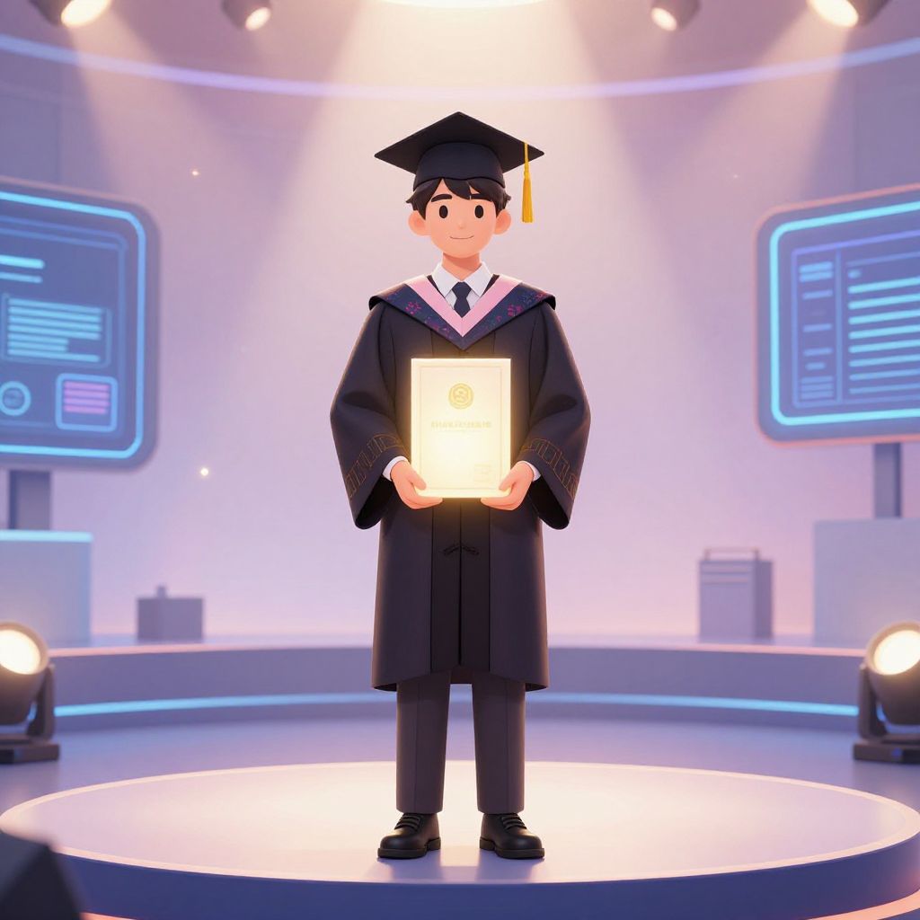 Digital CGI of a cute, anime-style male graduate with black cap and gown, holding a diploma, standing on a spotlighted stage.