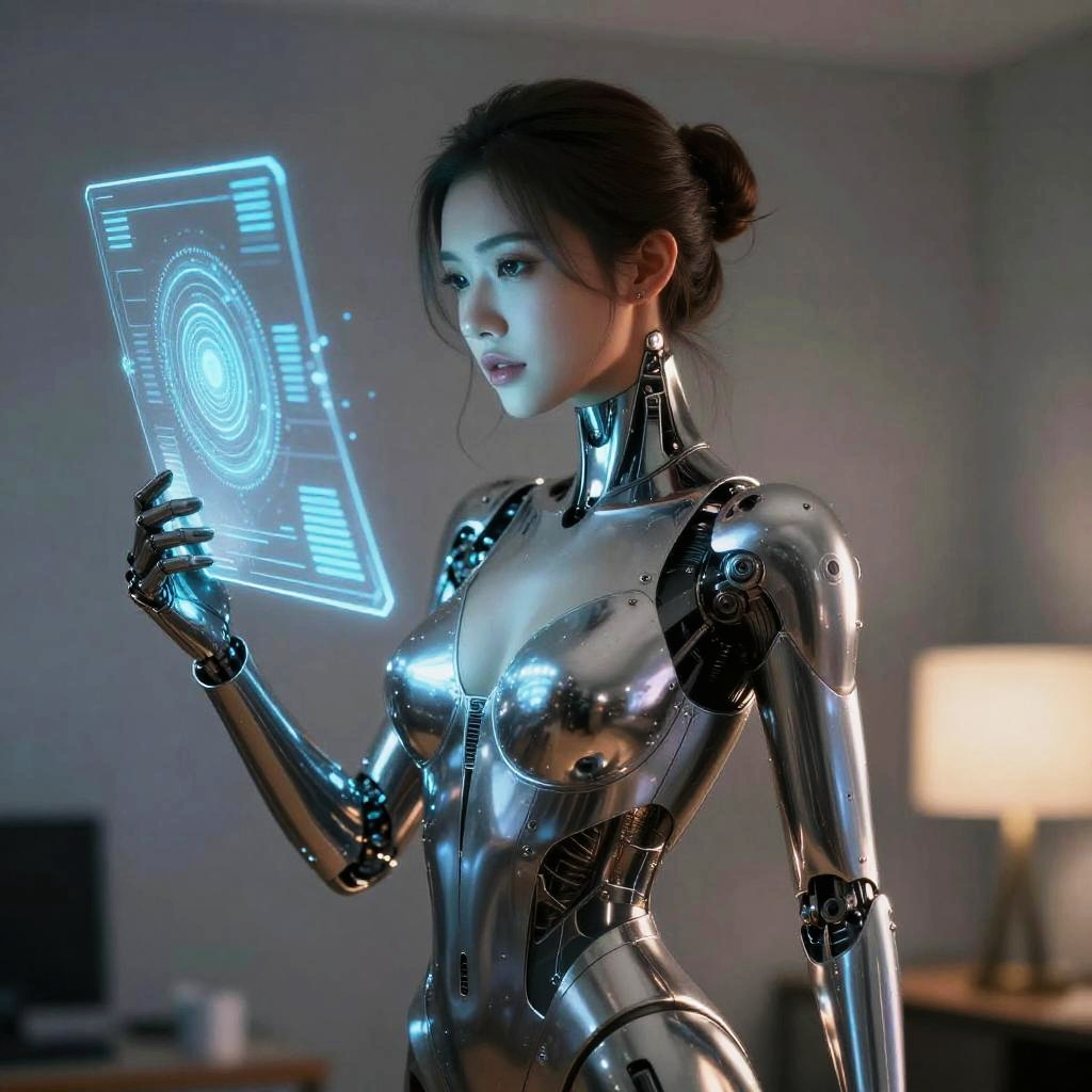 Sexy AI prompts, seductive android in sleek metallic body, holographic interface projection, ambient lighting, sci-fi art, ultra-realistic
