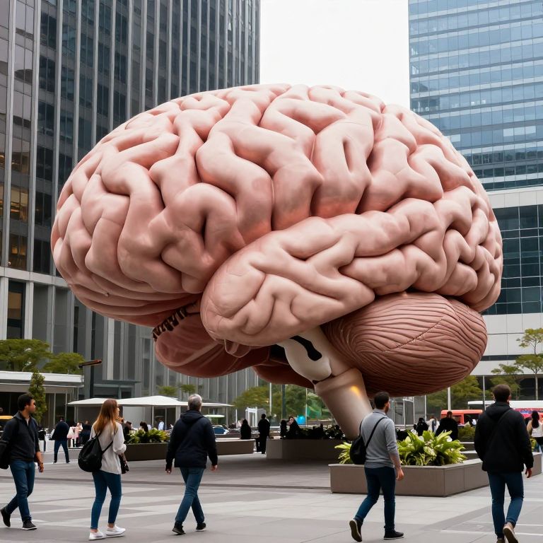 Gigantic brain sculpture dominates a bustling cityscape, its intricate folds towering above modern skyscrapers while pedestrians stroll along the foreground, blending imagination with urban reality.