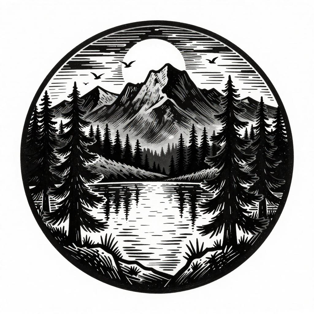 This is a primitive lino cut illustration. Stark black and white silhouettes depict a stepped ziggurat temple rising within a rocky highland plateau with scattered boulders. Two stylized cloud forms drift above while small birds circle. Soft muted teal backdrop, deckled and grainy border, ink bleed, slight misregistration, paper fiber texture. Bold contrast, limited palette, strong negative space, rustic, contemplative mood.