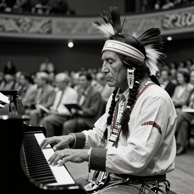 A Native American chief, dressed in traditional attire, plays the piano in a crowded music hall, captured by Ara Güler in 1966.