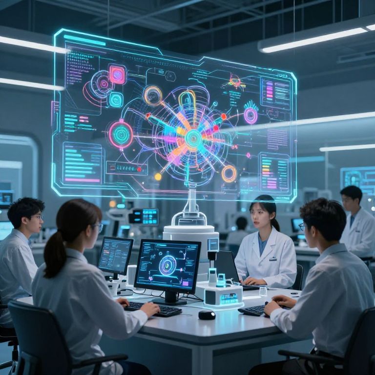 Photograph of a modern, high-tech laboratory with five Asian scientists in white lab coats sitting around a white table. They are focused on multiple computer monitors displaying intricate, colorful holographic diagrams and data. The holographic display, in neon blue, pink, and green, shows interconnected circles and lines, resembling a complex network or DNA structure. The background is a sleek, well-lit lab with white walls and fluorescent lights. The scientists, three women and two men, are engaged in collaborative work, highlighting a futuristic, tech-driven environment.