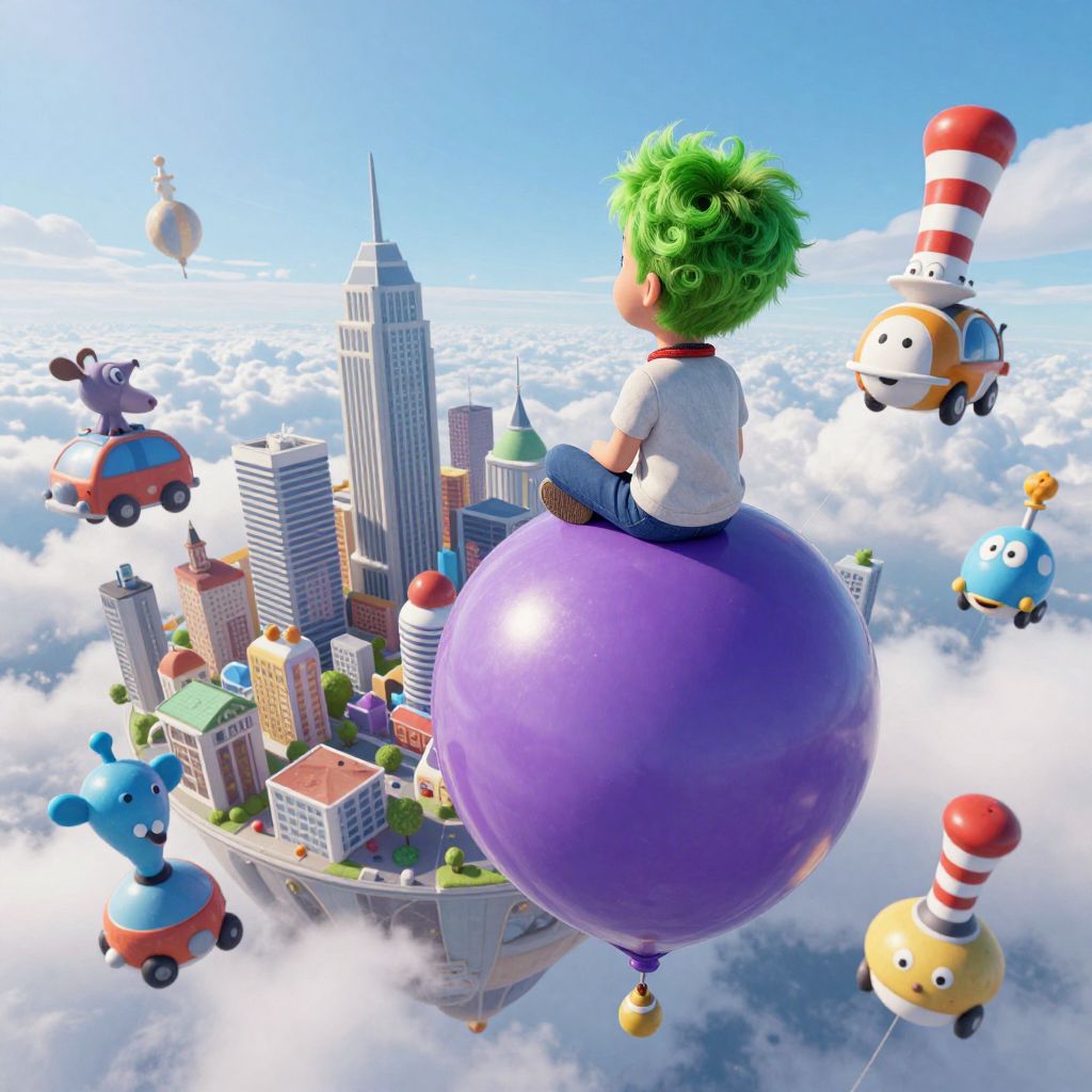 An imaginative digital artwork depicting a whimsical floating world above the clouds, featuring a curious young child with vibrant green hair sitting cross-legged atop a giant purple balloon, observing an aerial metropolis from a unique perspective reminiscent of Dr. Seuss' distinctive style. The scene is filled with fantastical creatures and peculiar vehicles soaring through the sky, creating a sense of wonder as they interact in this imaginative cityscape.