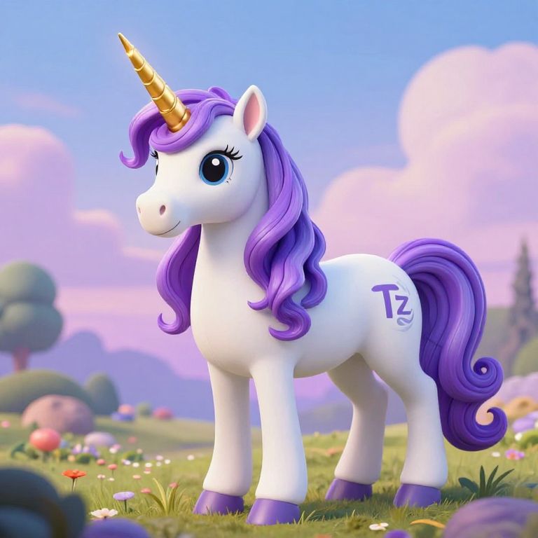 A whimsical unicorn with a radiant golden horn and flowing purple mane stands serenely in a vibrant, dreamlike landscape, its body marked by a mysterious \"Tz\" emblem, defying the boundaries of reality and imagination.