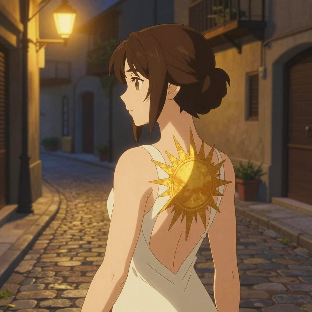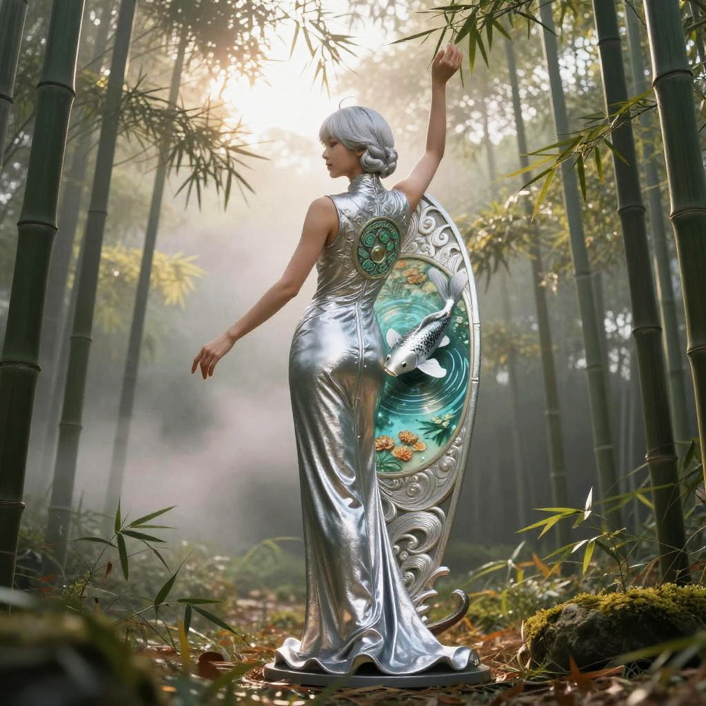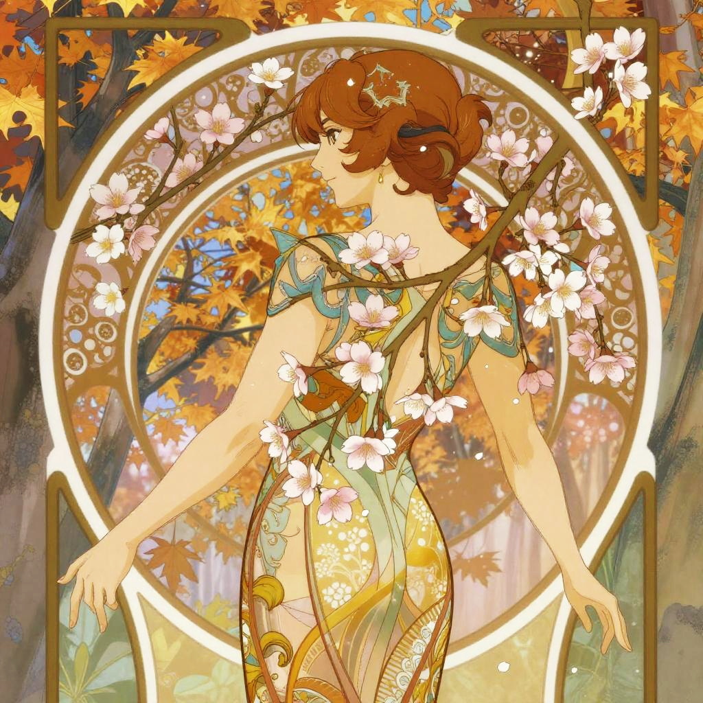 Anime-inspired character with biomechanical tattoo along spine, gracefully rendered in Art Nouveau style, set against an underwater coral vista