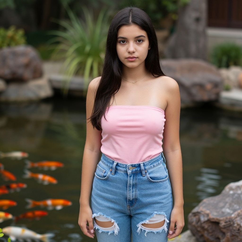Photograph of a young woman with long dark hair and light olive skin, standing in front of a classic white fountain with water droplets. She's wearing a white t-shirt with pink tie-dye stripes and high-waisted blue jeans. The background has a colorful garden with blooming flowers, adding a vibrant contrast to her outfit. She's looking directly at the camera with a neutral expression.