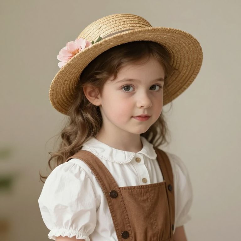 Close-up portrait of a joyful young girl with curly brown hair, wearing a wide-brimmed straw hat, smiling brightly at the camera while showcasing her charming gap-toothed smile.