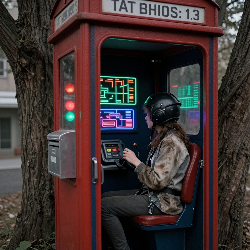 Very small phone booth with attached mailbox, surrounding an adult woman in dirty clothes sitting in a red and dark blue treehouse, creating a hyperpunk scene with desaturated brown and dark blue details, colorful (polaroid:0.7) with vibrant colors, (vacations, high resolution:1.3), (small, selective focus, european film:1.2), (sexual advance:1.1), closeup, [signal light|emergency light|red light|red light|green light|neon light_light signal, chart|analysis chart|monitoring screen |Various indicators|marquee|head-up display_LED signage, observation window|main window|side window_window, handle|indicator|window|slogan|light signal_hatch, leather seat|helmet|adjuster|headset| Pedal_Driver's Seat:0.4], [Metal|Leather|Flash|Neon|Glass|Screen|carpaint_Detailed Texture: 0.7], (sci-fi:1.2), (futuristic:1.2), (dystopian:1.1), (realistic:1.2), (industrial:1.2), (mecha:1.1), OverallDetail, great lighting, zoya, clear, scifiurban, treehouse