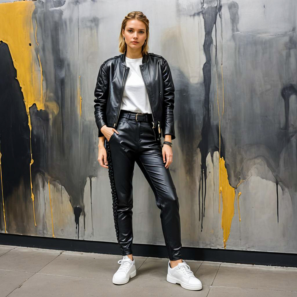 Portrait of a lean young woman with braided blonde hair wearing black leather pants, a matching black leather jacket, a white cotton t-shirt, black sneakers, and silver accessories. She is posing confidently against a dark gray urban wall with yellow artistic paint details, embodying an edgy, urban chic style with a sleek silhouette.