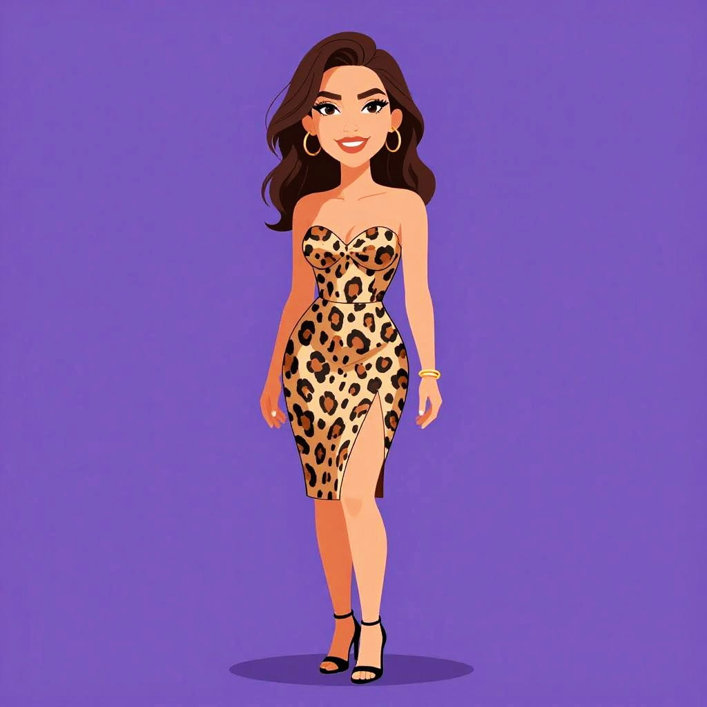 Illustration of a confident woman with long dark hair wearing an olive green cropped tank top and a high-waisted leopard print skirt with an asymmetrical hemline. She accessorizes with large gold hoop earrings and a chunky gold cuff bracelet. The background features a simple purple tone, emphasizing the subject's edgy and fashionable style.