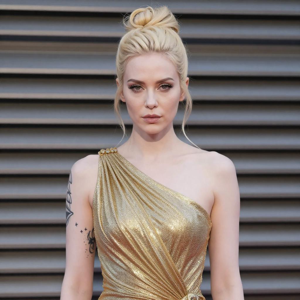 Woman with pale skin and blonde hair in an elaborate updo wearing a shimmering gold one-shoulder dress with visible tattoos on her left arm. She has intense eyes and a neutral expression. Background features blurred, horizontal lines. Centered in the frame.