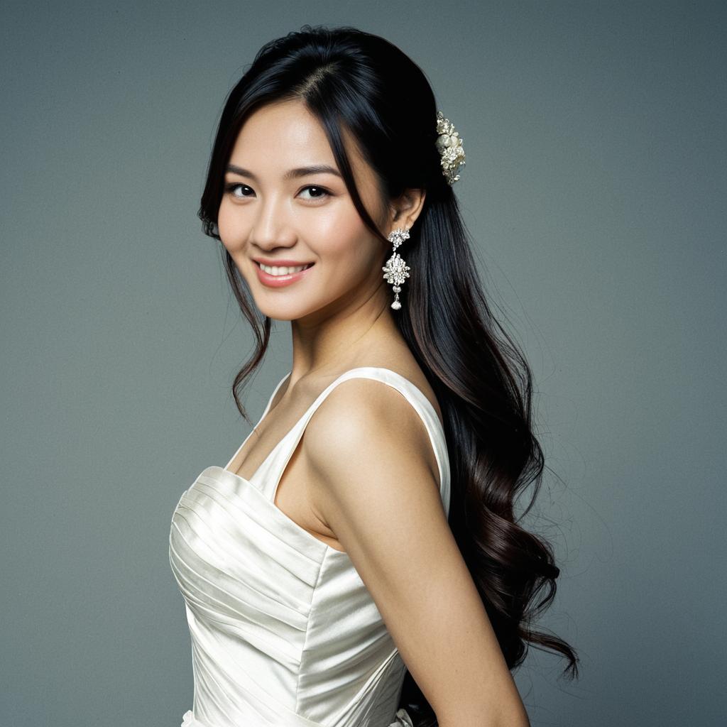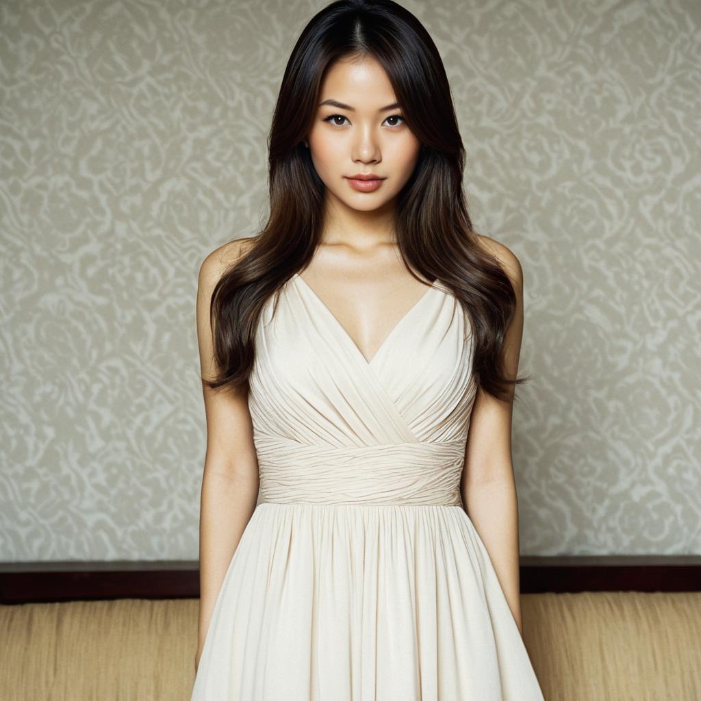 Portrait of an Asian woman standing and looking at the viewer. She has long brown hair and brown eyes, wearing a beige sleeveless cocktail dress with a deep V neckline and gathered waist. The background features a light patterned wallpaper and wooden trim.