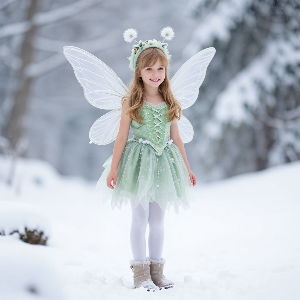 Winter Fairy Tinkerbell Costume, girl dressed in fairy costume standing in snow