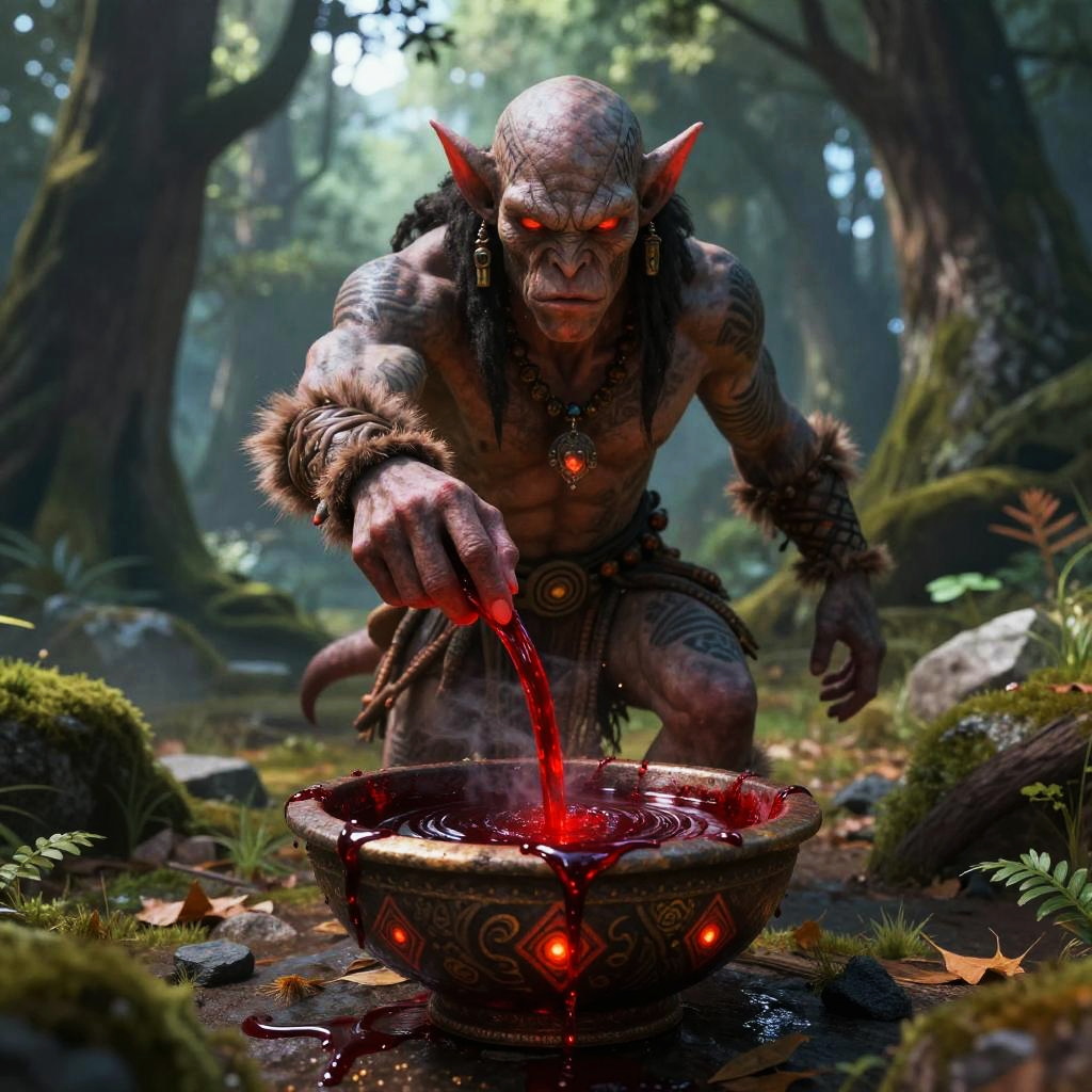 Gnoll blood flowing into a ritualistic bowl, tribal markings glowing faintly, shaman gnoll casting a spell, mystical forest clearing, vibrant colors, highly detailed fantasy scene