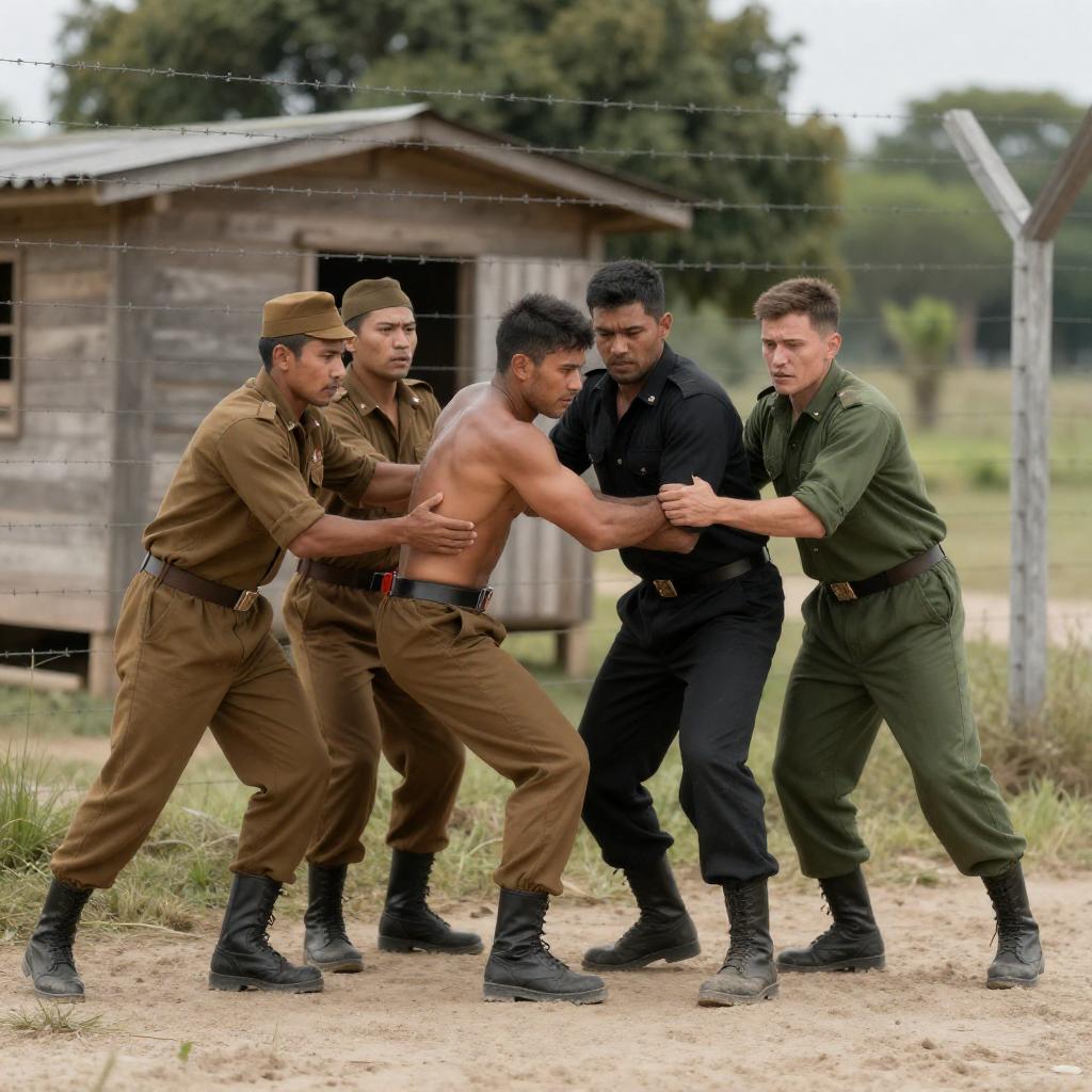Photograph of five men in front of a barbed wire fence. Three men in brown uniforms with hats, one shirtless with a muscular build, one in black uniform, and one in green. Wooden hut in background, trees behind. Shirtless man being pushed by man in green. Intense expressions. Sandy ground, grass patches.