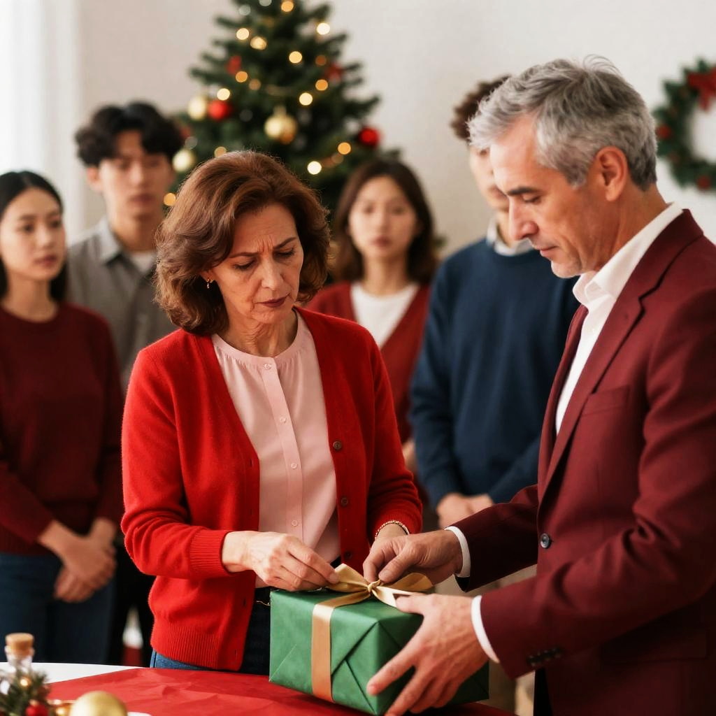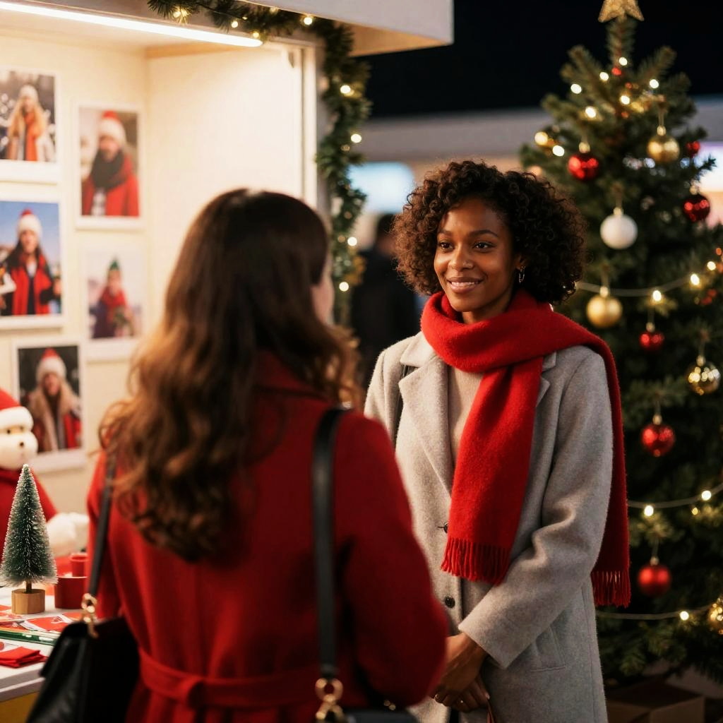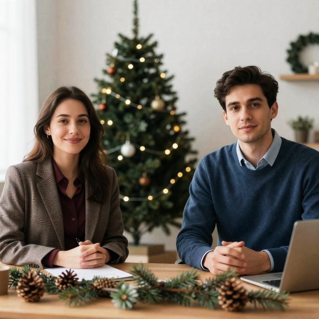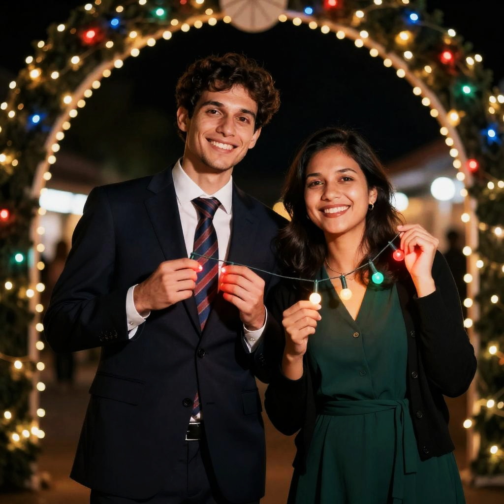 Photograph of a man and woman decorating Christmas lights around green and red tinsel. Both smiling, woman on right wearing green dress, man on left in suit with striped tie. Multicolored lights in background. Nighttime setting with trees. Woman holding tinsel on right, man holding lights on left.