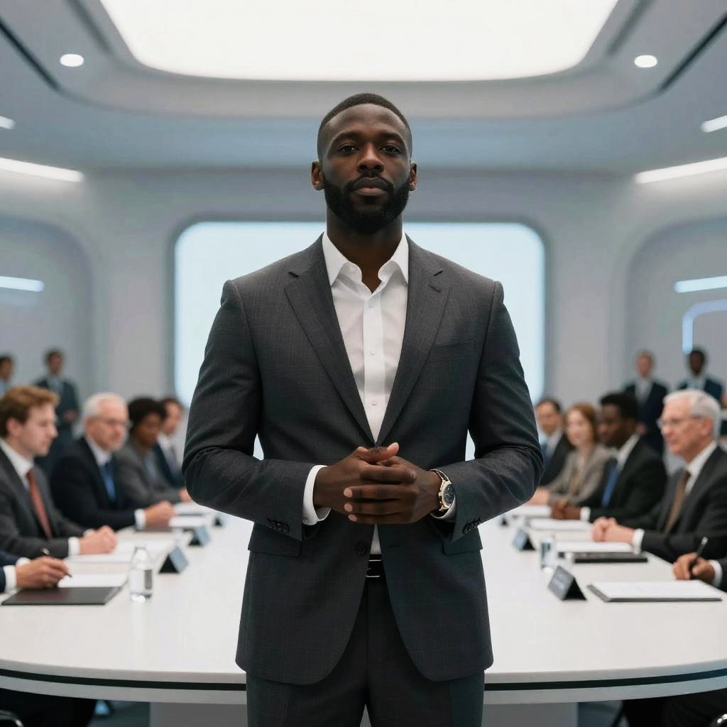 Photograph of a tall, muscular Black man with a short beard and dark skin, standing in a modern, well-lit conference room. He wears a dark gray suit with a white dress shirt, hands clasped in front of him. The background features a large, white, illuminated wall and a round white table with several people seated around it, dressed in formal attire, engaged in conversation. The room has a sleek, futuristic design with recessed lighting in the ceiling. The man's confident posture and serious expression dominate the image.
