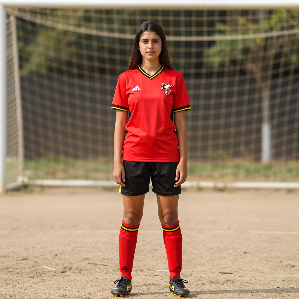 Girl football costume, photograph of young girl soccer player, standing on green field, daytime, athletic black and white soccer jersey with Adidas , white shorts, white wristbands, long brown hair in two braids, serious expression, soccer goal in blurred background, natural light, outdoor, sports, portrait, realistic, school soccer team, casual, summer