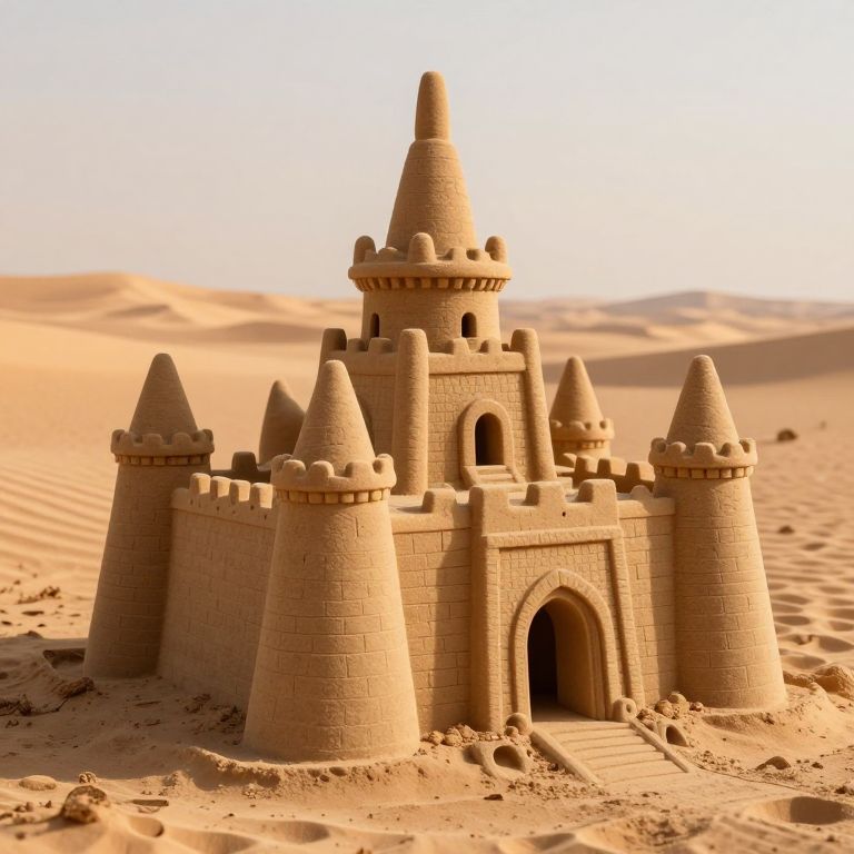 A meticulously crafted 3D-rendered sandcastle stands proudly on a desert plain, its conical turrets and arched gateways evoking a sense of timeless fantasy, as if sculpted by industrious ants predicting the future through the gradual erosion of their intricate structures under golden-hour lighting.