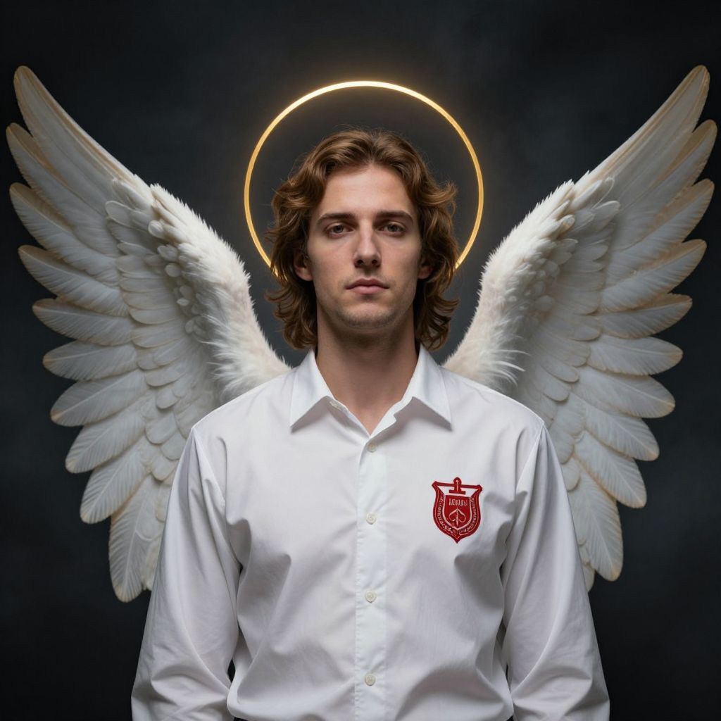The image depicts a striking portrait of a man adorned with the attributes of an angel. He is dressed in a white shirt with a red emblem on the left side, suggesting a connection to a team or organization. The man's face is framed by a golden halo, symbolizing his divine status. His wings, a blend of white and gray, extend from his back, adding to the ethereal quality of the image. The background is a dark, smoky gradient, creating a dramatic contrast that highlights the figure. The overall composition is balanced, with the man centrally positioned, and the halo and wings framing his face, drawing the viewer's attention to his serene expression. The image evokes a sense of reverence and admiration, capturing the essence of a revered figure.