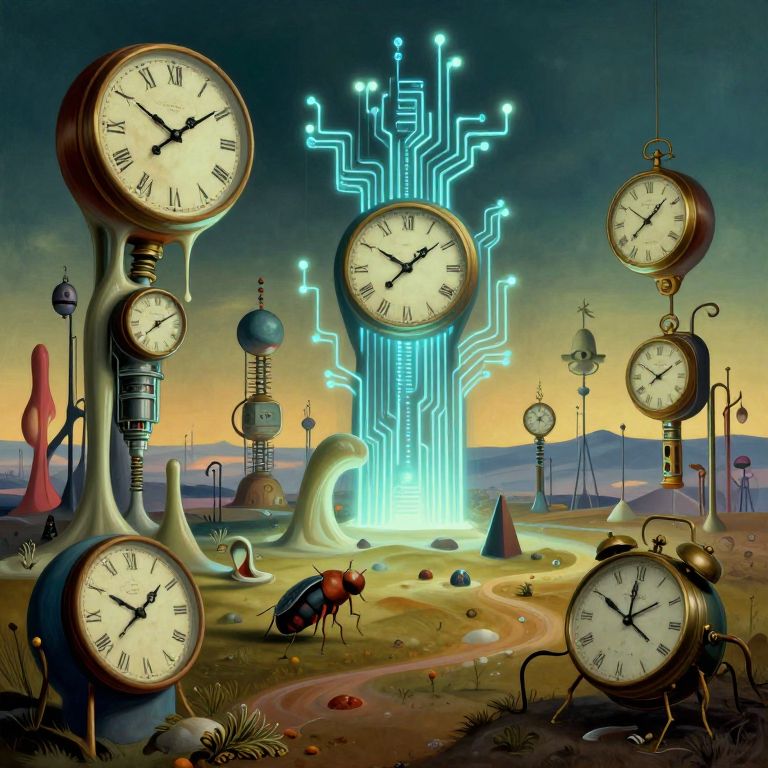 Surreal digital artwork: Clocks with glowing blue circuitry rising from a desert, surrounded by insects and bizarre, futuristic structures.