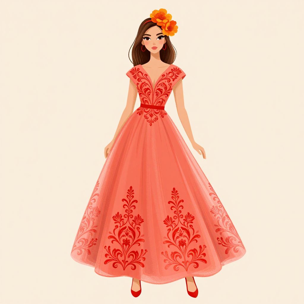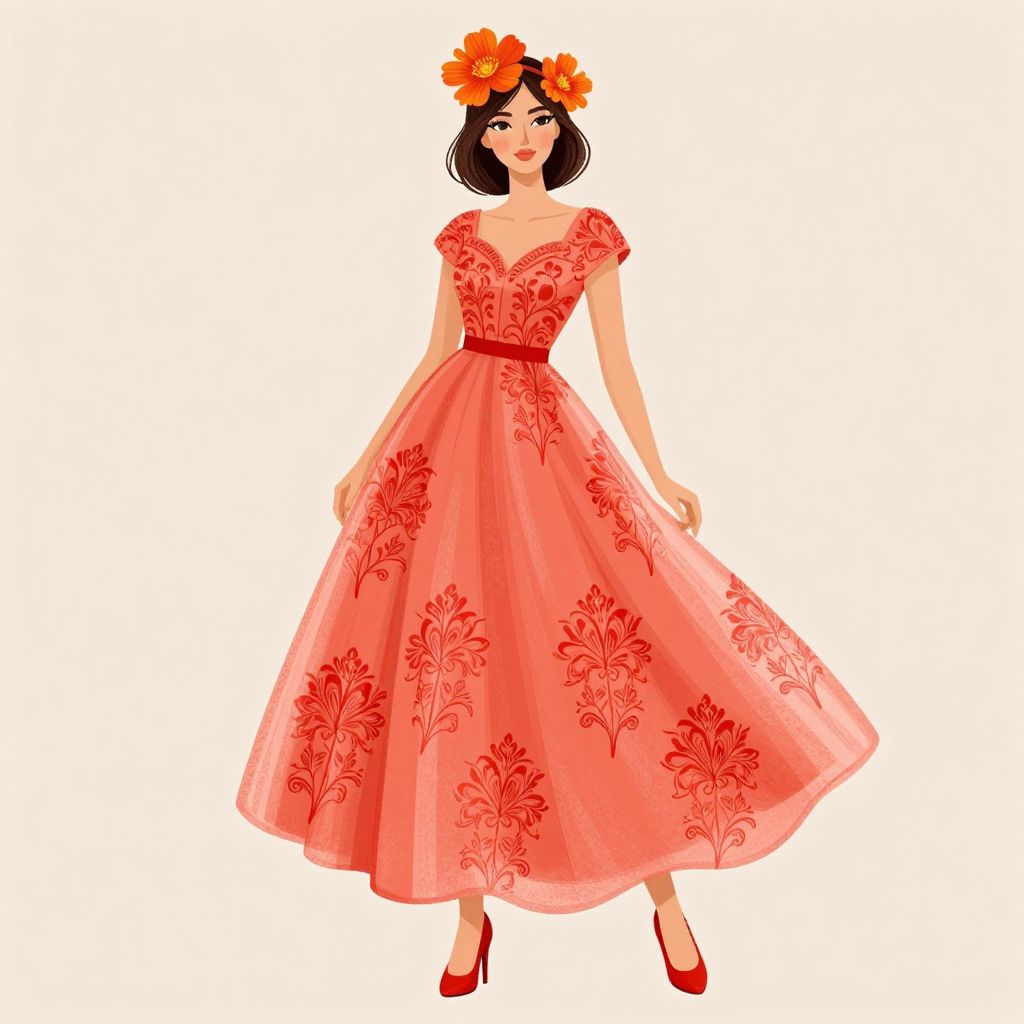 Digital illustration of a woman in a red floral dress with a red belt, orange flower headpiece, and red heels, standing against a white background.