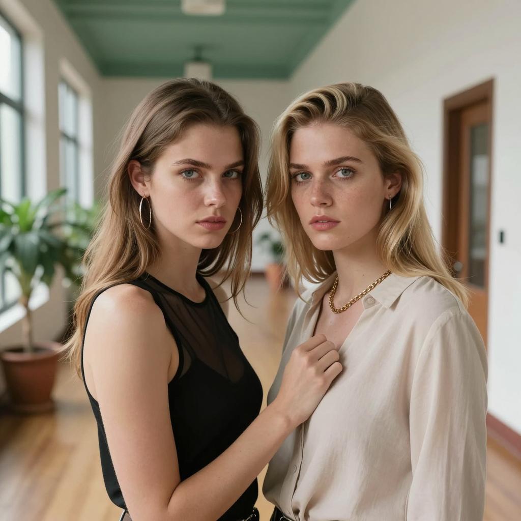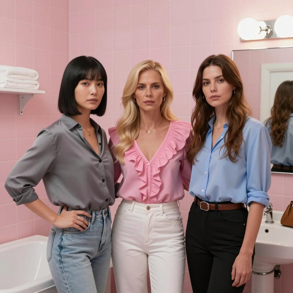 Three women in a pink-tiled bathroom. Left woman with short black hair, gray blouse, light jeans, hands on hips. Center woman with blonde hair, pink ruffled top, white pants, neutral expression. Right woman with long brown hair, blue shirt, black pants, brown belt, serious expression. White sink with faucet and brown bag on right. Shelves on left. Mirror on back wall.