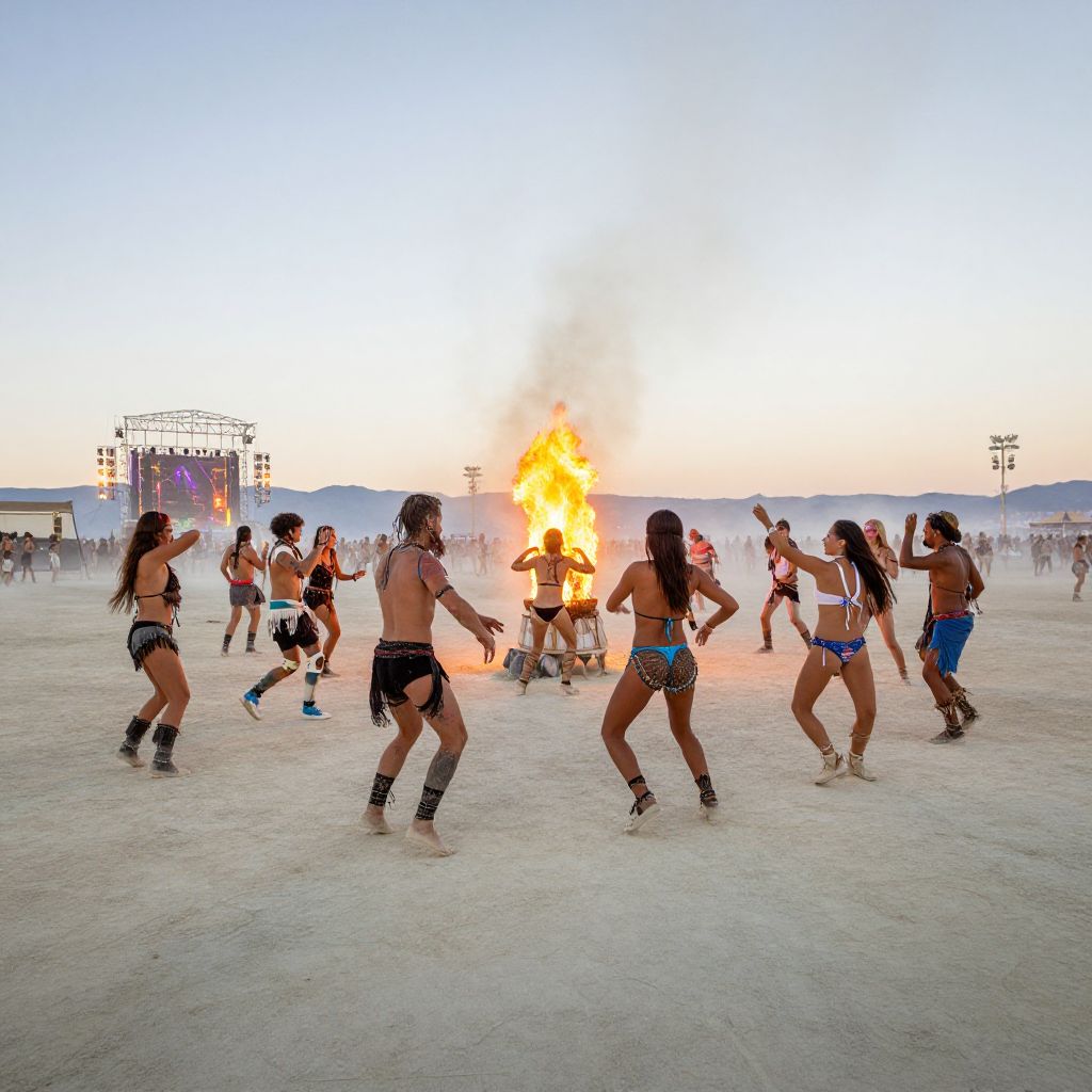 Photograph of a nighttime outdoor dance party on a flat, sandy desert. Eleven women with various skin tones and long hair, wearing revealing tribal-style dance outfits in black, blue, and pink, are dancing energetically around a large, bright fire. The sky is clear, transitioning from blue to orange near the horizon. Background includes stage lights and distant mountains. The women wear black knee-high boots and some have accessories like arm bands. The fire's flames are centered in the background, illuminating the scene.