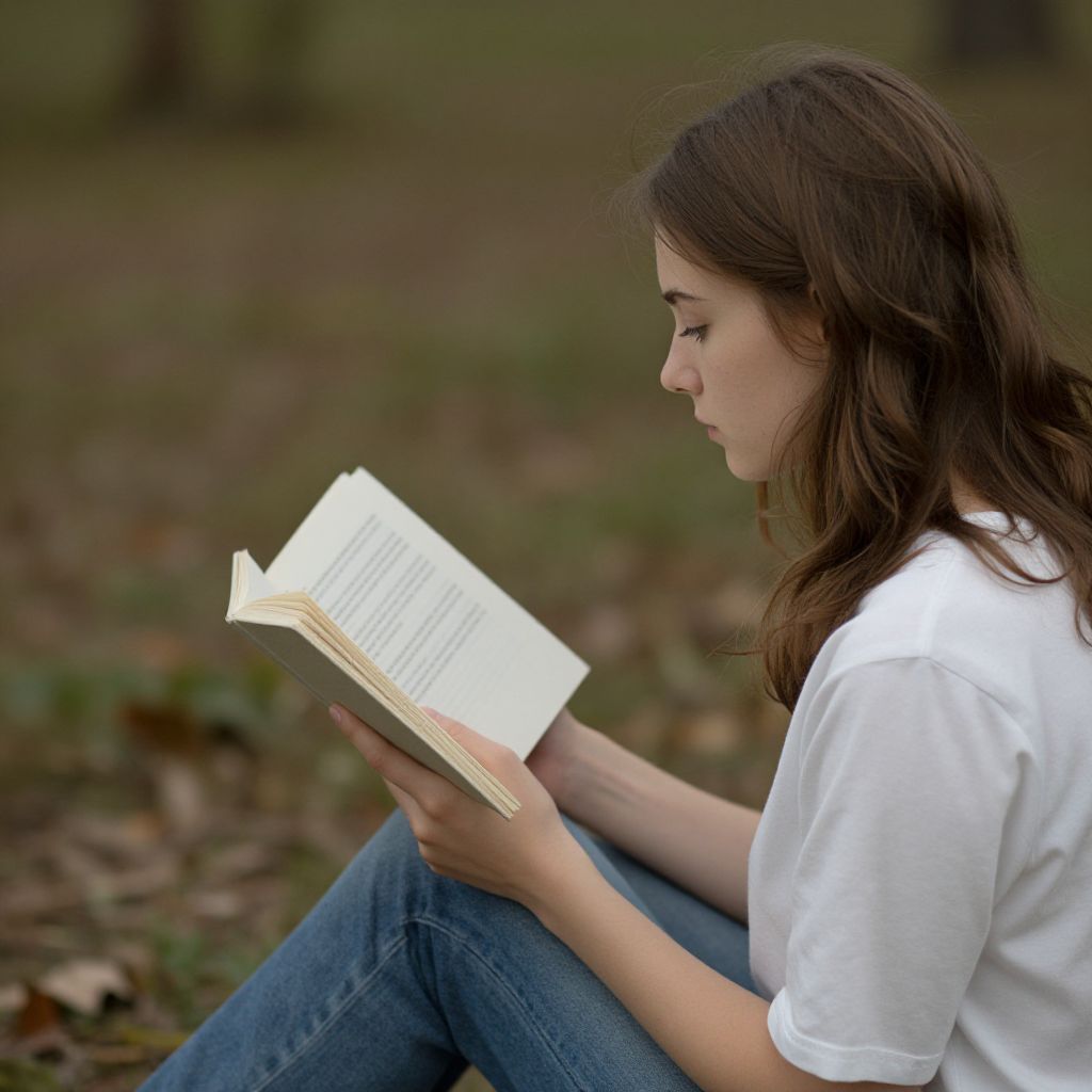 Photograph of a young woman with long brown hair, wearing a white t-shirt and blue jeans, sitting outdoors reading a book.