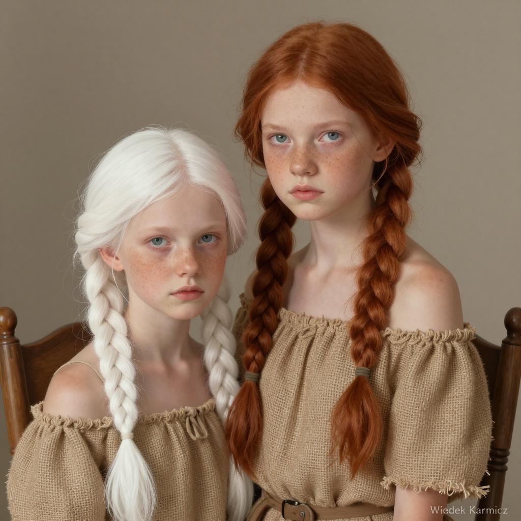 Photograph of two young women with fair skin and long red hair, standing close. The taller woman wears a floral crown, the shorter one a lace dress. Both have delicate features, with the taller woman's arm around the shorter one's shoulders. Soft, bokeh light in the background. Taller woman's hand rests on the shorter woman's chest. Intense, gentle facial expressions. Light, ethereal color palette. Watermark in the bottom right corner.